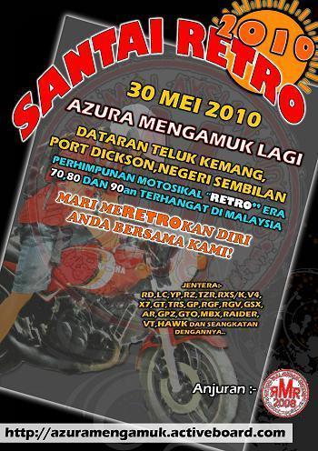 1. Pada kali ini, RMR mendapat kerjasama dari ARENA's Entertaiment serta sokongan dari Majlis Perbandaran P.Dickson untuk menjayakan acara perjumpaan RMR seperti tahun-tahun sebelumnya. Kalau sebelum ini kita hanya membuat sekadar santai, datang lepak, Insyallah pada kali ini 2010 kita akan membuat santai retro secara Karnival. Maka pelbagai xtvt telah diaturkan kepada pemilik-pemilik motorsikal RETRO yang hadir pada kali ini.